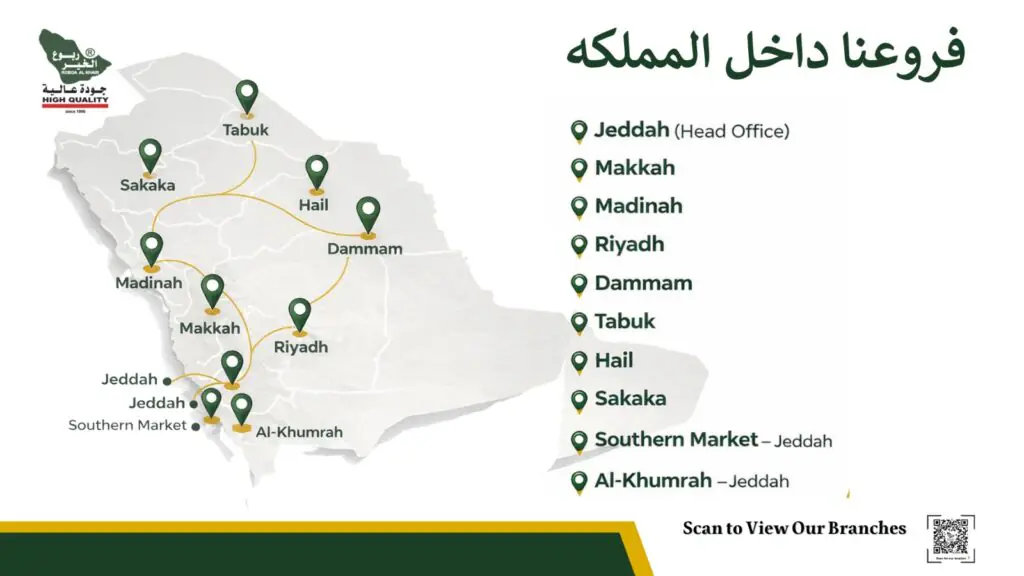 تمتلك ربوع الخير شبكة فروع استراتيجية تضم 10 فروع، مجهزة بمستودعات ضخمة لضمان تلبية طلبات الجملة والتوريد بسرعة وكفاءة عالية.